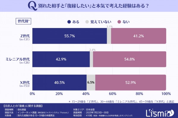 Z世代では過半数を超える55.7%の人が復縁を真剣に検討した経験があると回答しました。