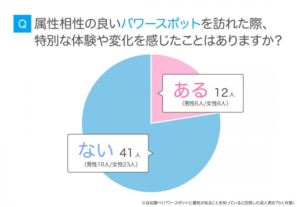 「属性相性の良いパワースポットを訪れた際、何か特別な体験や変化を感じたことはありますか?」という質問に対して、「ある」と回答した人は53人中12人と、約2割程度にとどまりました。この結果を見て、「意外と少ないな」と感じた方もいるかもしれません。