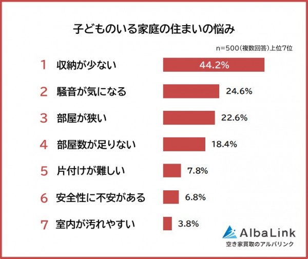 株式会社AlbaLinkが中学生までの子どもがいる500人を対象に実施した調査では、子育て世帯特有の住まいの困りごとと、その解決策について詳しく調査しました。