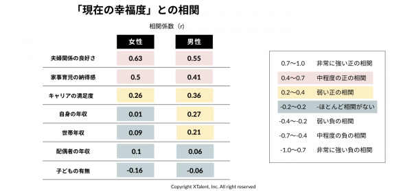 その相関係数は女性で0.63、男性で0.55。世帯年収や子どもの有無よりも、はるかに強い影響を持っていました。