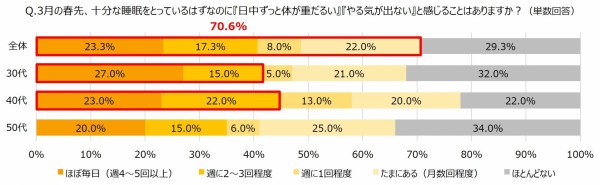 調査によると、春先に「体がだるい」「やる気が出ない」と感じた経験がある女性は、実に約7割にのぼりました。